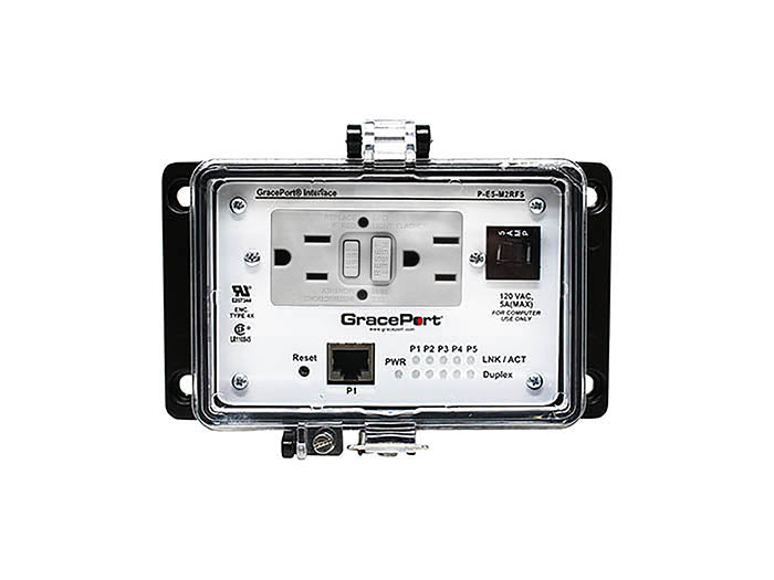 Panel Interface Connector with Ethernet Switch; Panel Mount Housing; UL Type 4X; GFCI Duplex Inside-Outlet; 5 Amp Circuit Breaker