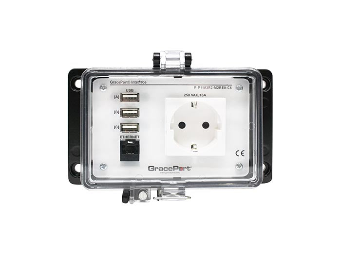 Panel Interface Connector with USB Type A/F to USB Type A/M with 6 ft cable; Category 5e RJ45; Panel Mount Housing; UL Type 4; Continental European Outlet with GFCI; 3 Amp Circuit Breaker