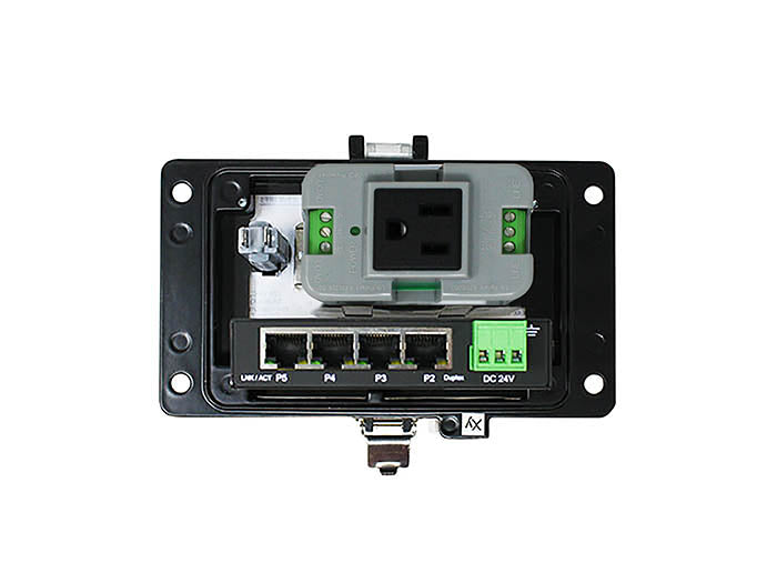 Panel Interface Connector with Ethernet Switch; Panel Mount Housing; UL Type 4X; GFCI Duplex Inside-Outlet; 5 Amp Circuit Breaker