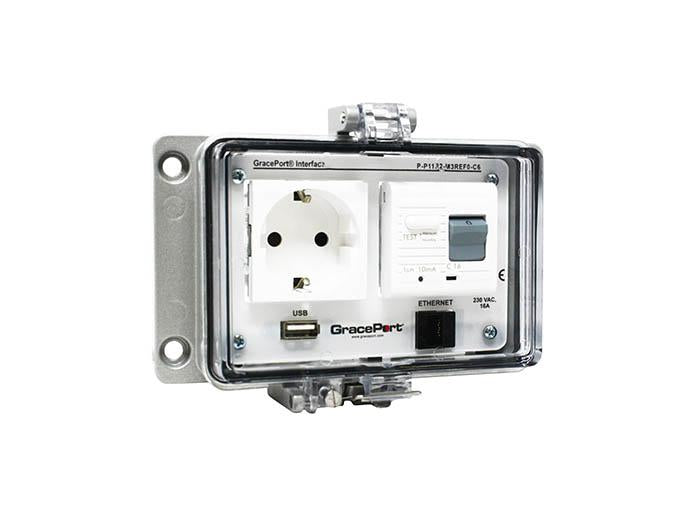 Panel Interface Connector with USB Type A/F to USB Type A/M with 6 ft cable; Category 5e RJ45; Panel Mount Housing; UL Type 4; Continental European Outlet with GFCI; 3 Amp Circuit Breaker