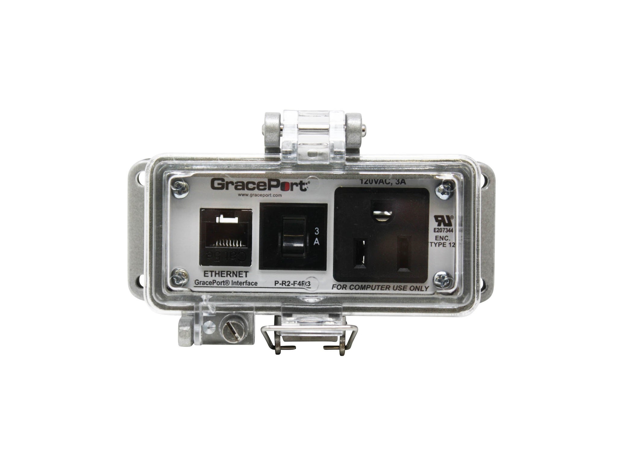 Panel Interface Connector with Category 5e RJ45; Panel Mount Housing; UL Type 12; Simplex Outlet; 3 Amp Circuit Breaker