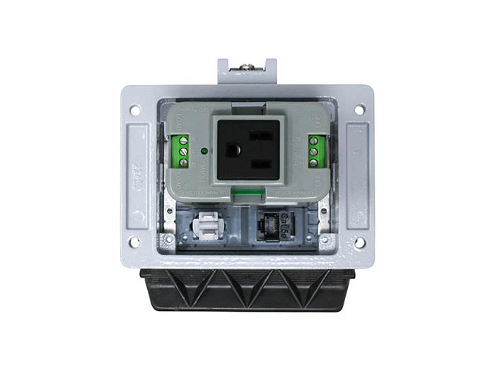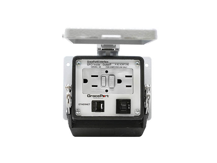 Panel Interface Connector with Category 5e RJ45; Panel Mount Housing and Metal Cover; GFCI Inside-Outlet 125 VAC Outlet, 3A Circuit Breaker